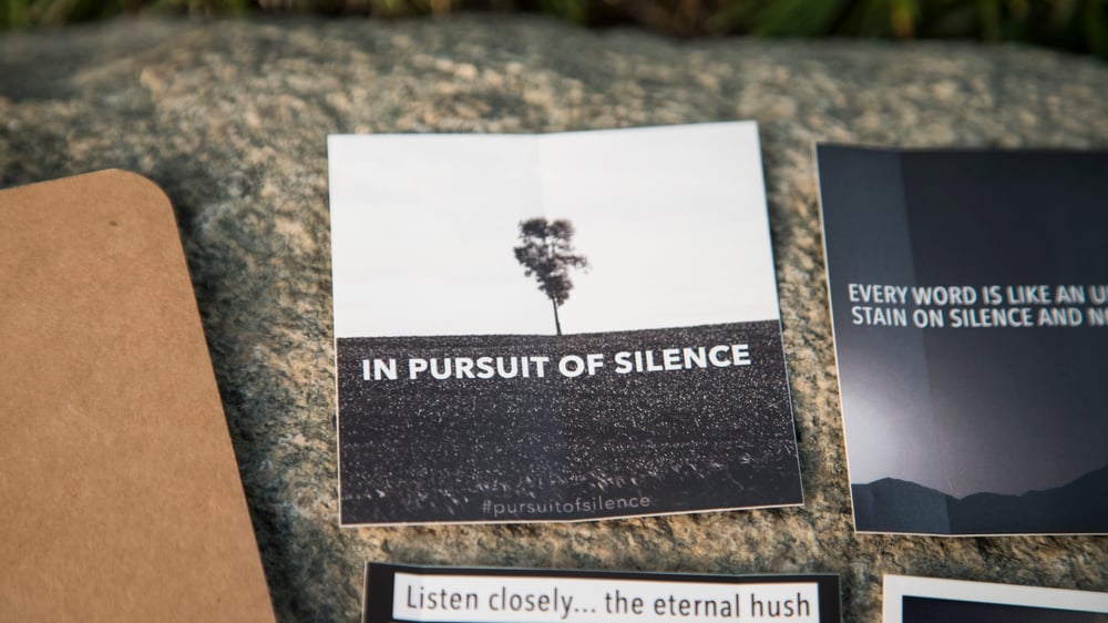 A selection of items to help you bring more silence into your life. The Silence Kit includes TWO blank notebooks and FOUR special edition vinyl 3"x3" stickers. Available until supplies last.